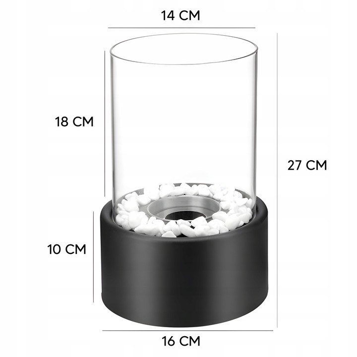 - Zestaw zawiera – Biokominek, ozdobne kamienie w dwóch kolorach oraz wygaszacz płomienia.