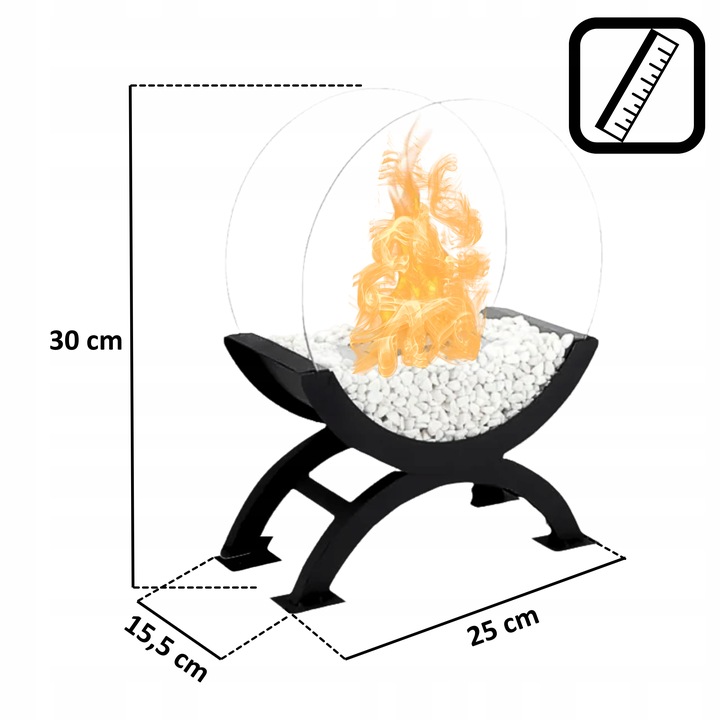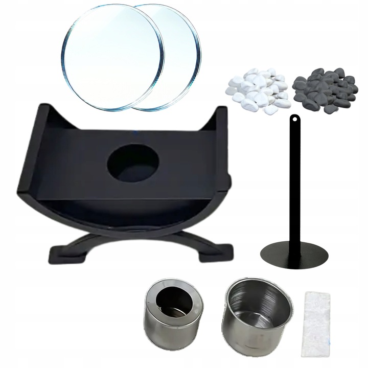 Korpus wykonano ze stali, a płomień chroni szkło hartowane borokrzemowe. Dodatkowo, zestaw zawiera ozdobne kamienie w dwóch kolorach, które pozwalają spersonalizować wygląd urządzenia. Dochodzi do tego wygaszacz do bezpiecznego gaszenia oraz wełna ceramiczna, wspomagająca stabilność płomienia.